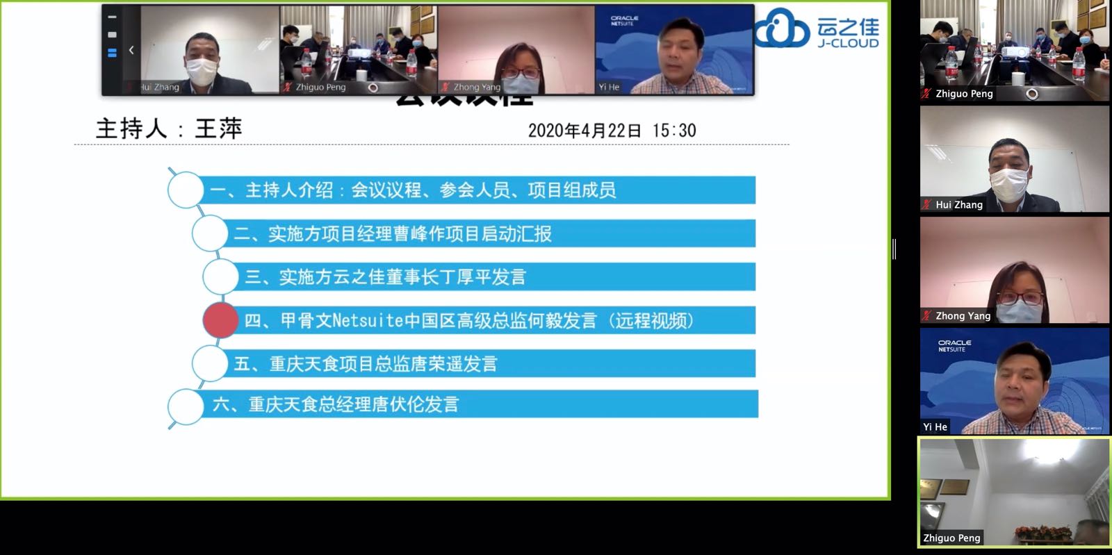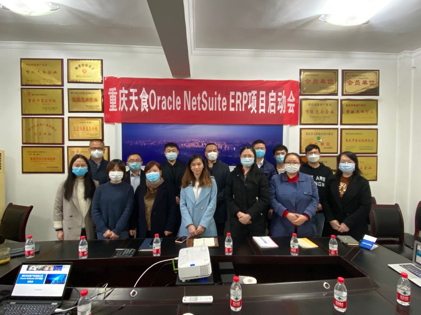 2020年4月22日,在克服新型冠狀病毒疫情嚴重影響的重重困難后,重慶天食畜產品有限公司Oracle NetSuite ERP項目啟動大會正式召開,本次啟動會由重慶天食財務經理王萍主持,參加啟動會的有:重慶天食畜產品有限公司總經理唐伏倫、副總經理唐榮遙及重慶天食項目組成員等;Oracle NetSuite中國區高級總監何毅、西南區銷售總監楊仲、高級銷售經理彭志國、高級咨詢顧問張輝等;重慶云之佳科技股份有限公司董事長丁厚平、項目經理曹峰、項目組實施顧問李佳及項目組成員等。