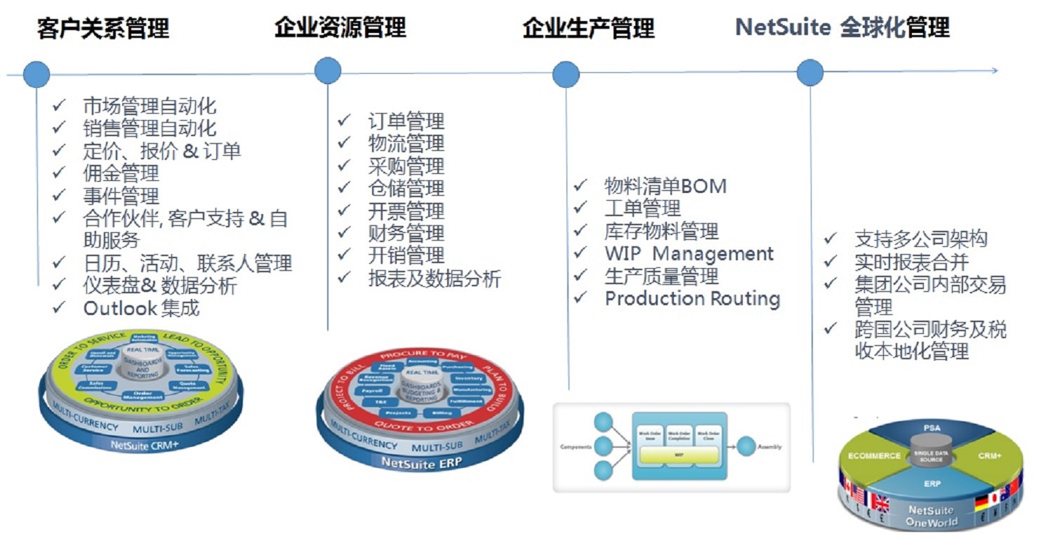 Oracle NetSuite 云ERP:Oracle NetSuite 云ERP是目前全球排名NO.1的云ERP產品,全球有超過40000家客戶。實施Oracle NetSuite ERP系統,旨在對企業各業務環節進行全面梳理和業務流程再造,實現企業的規范管理和全面管控,全力提升企業的管理水平,包括企業資源計劃(ERP)、客戶關系管理(CRM)、服務資源計劃(SRP)、項目管理(PM)、人力資源(HCM)、商務智能(BI)等。另外,由于是云端服務,企業不需要搭建數據中心等基礎設施,也省掉對基礎設施和ERP系統運維的煩惱,大大降低了ERP等信息系統的使用門檻,節約投資,提升企業的管理水平。