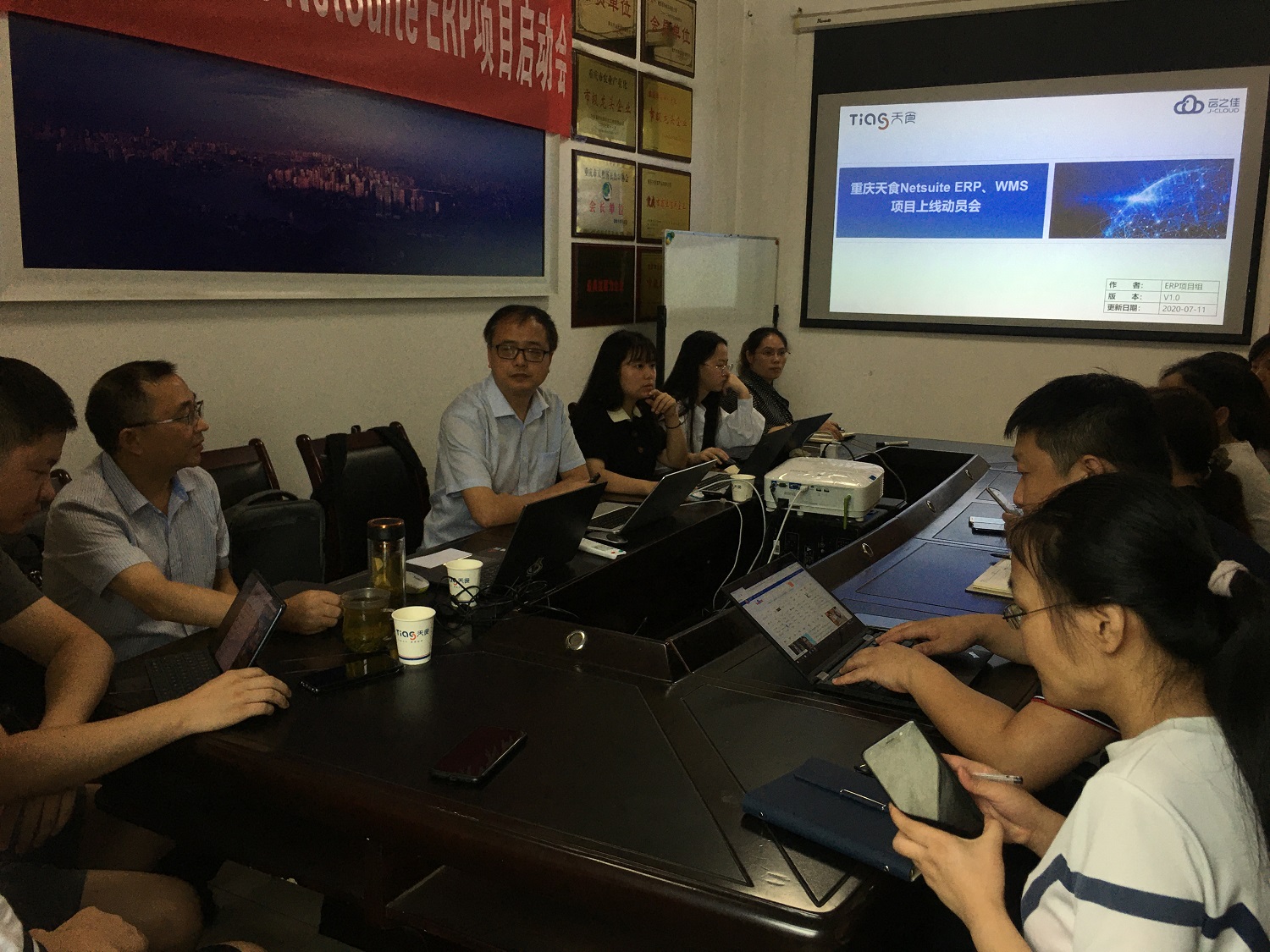 2020年7月11日重慶天食畜產品有限公司召開重慶天食NetSuite ERP、J-CLOUD WMS項目上線動員會,出席會議的有:天食的總經理唐伏倫、項目總監唐榮遙、項目經理李十美及項目組成員;Oracle NetSuite高級銷售經理彭志國;云之佳(J-CLOUD)董事長丁厚平、項目經理曹峰、項目實施顧問杜嬌、李佳、袁榕等。