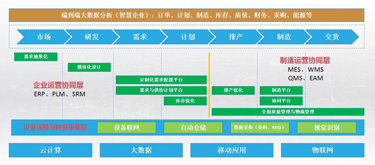 2)制造運營協同層:主要是對生產制造各環節進行有效的管控,包括數字化生產MES系統、數字化倉儲WMS系統、數字化質量QMS系統、數字化設備EAM系統等系統的制造運營管理MOM系統。