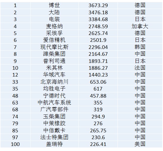 從上表可以看出,在世界100強企業中,日本27家、德國17家、美國15家、中國11家、韓國6家、法國6家、加拿大2家、西班牙3家、意大利2家、英國2家、瑞士1家、瑞典1家、盧森堡1家、墨西哥1家、印度1家、荷蘭1家。從整體實力上看,日本、德國、美國、中國排前四位。世界汽車零部件100強的門檻由2017年的131億元大幅提升到226億元。