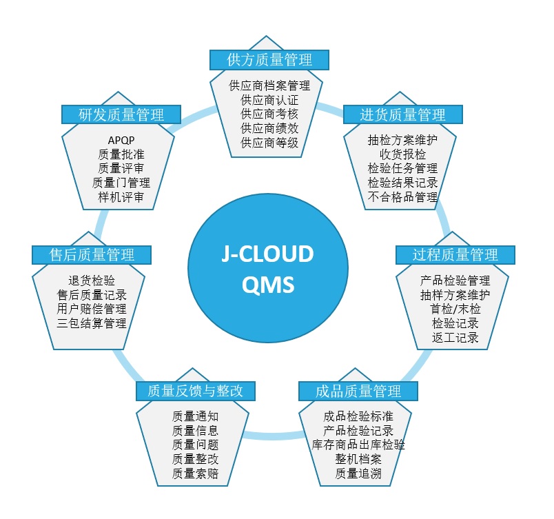 數字化質量管理QMS系統主要是對汽車產品的全價值鏈業務環節進行管控,包括研發、供方、進貨、過程、成品、售后等環節,以云之佳數字化質量管理QMS系統(以下簡稱云之佳QMS)為例,總體框架如下: