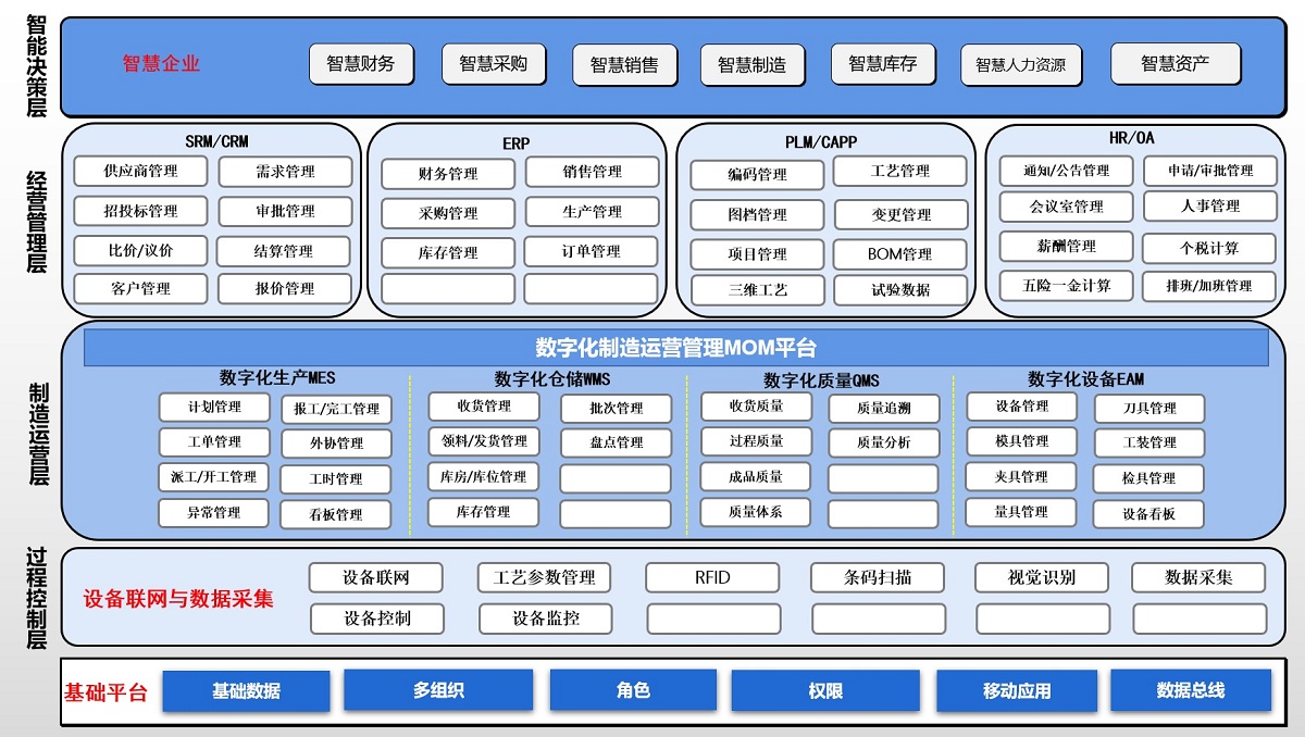 智慧企業(yè)系統(tǒng)總體架構(gòu)將構(gòu)建在基礎(chǔ)設(shè)施和基礎(chǔ)服務(wù)支撐平臺之上,從“智能決策層、經(jīng)營管理層、制造運(yùn)營層、過程控制層和數(shù)據(jù)中臺”五個(gè)方面各個(gè)層面的事務(wù)處理和業(yè)務(wù)信息化需求,也將兼顧未來企業(yè)的持續(xù)發(fā)展需要,支撐集團(tuán)智慧企業(yè)戰(zhàn)略的落地。