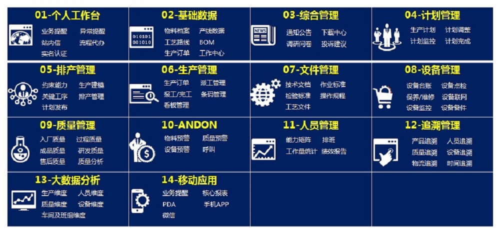 云之佳MES生產管理系統旨在打造支撐計劃管理、排產管理、生產管理、工藝文件管理、設備管理、質量管理、安燈管理、人員管理、追溯管理、大數據分析等業務環節進行有效管理和控制的生產執行系統。