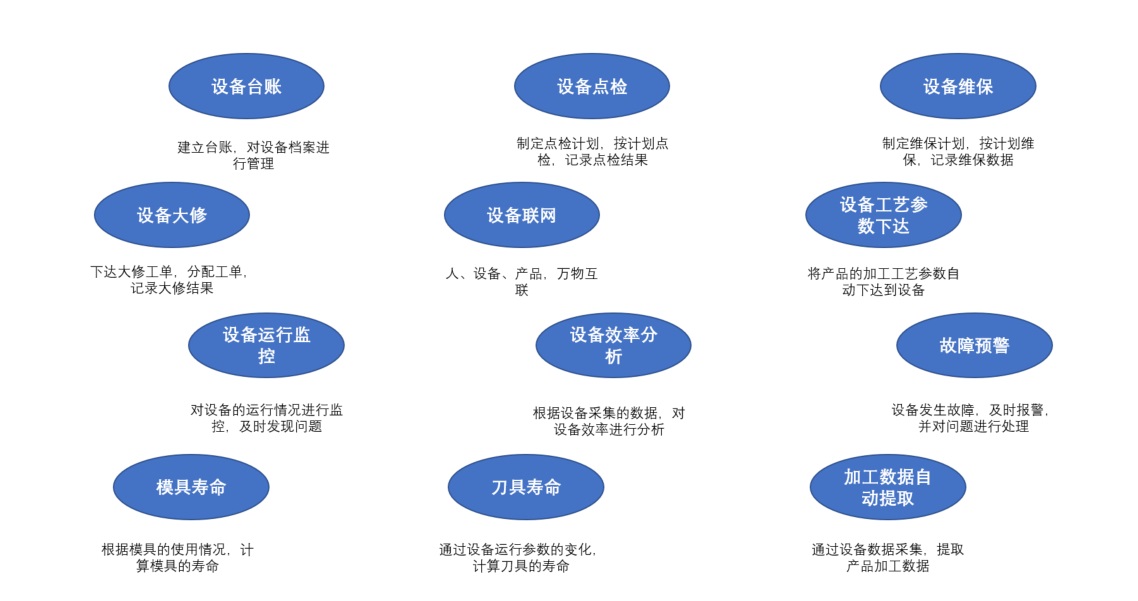 云之佳EAM數(shù)字化設(shè)備管理系統(tǒng)典型業(yè)務(wù)場(chǎng)景有:設(shè)備臺(tái)賬、設(shè)備點(diǎn)檢、設(shè)備維保、設(shè)備大修、設(shè)備聯(lián)網(wǎng)、設(shè)備運(yùn)行監(jiān)控、設(shè)備效率分析、故障預(yù)警、模具壽命、刀具壽命、加工數(shù)據(jù)自動(dòng)提取、設(shè)備工藝參數(shù)下達(dá)等。